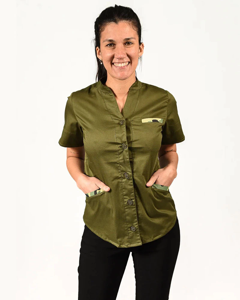 Nuestra chaqueta con botones Verde musgo con vivo camuflado verde ,está confeccionada en tela Spandex, elastizada y fresca , pensada para ofrecerte comodidad, funcionalidad y un look profesional durante toda la jornada laboral.