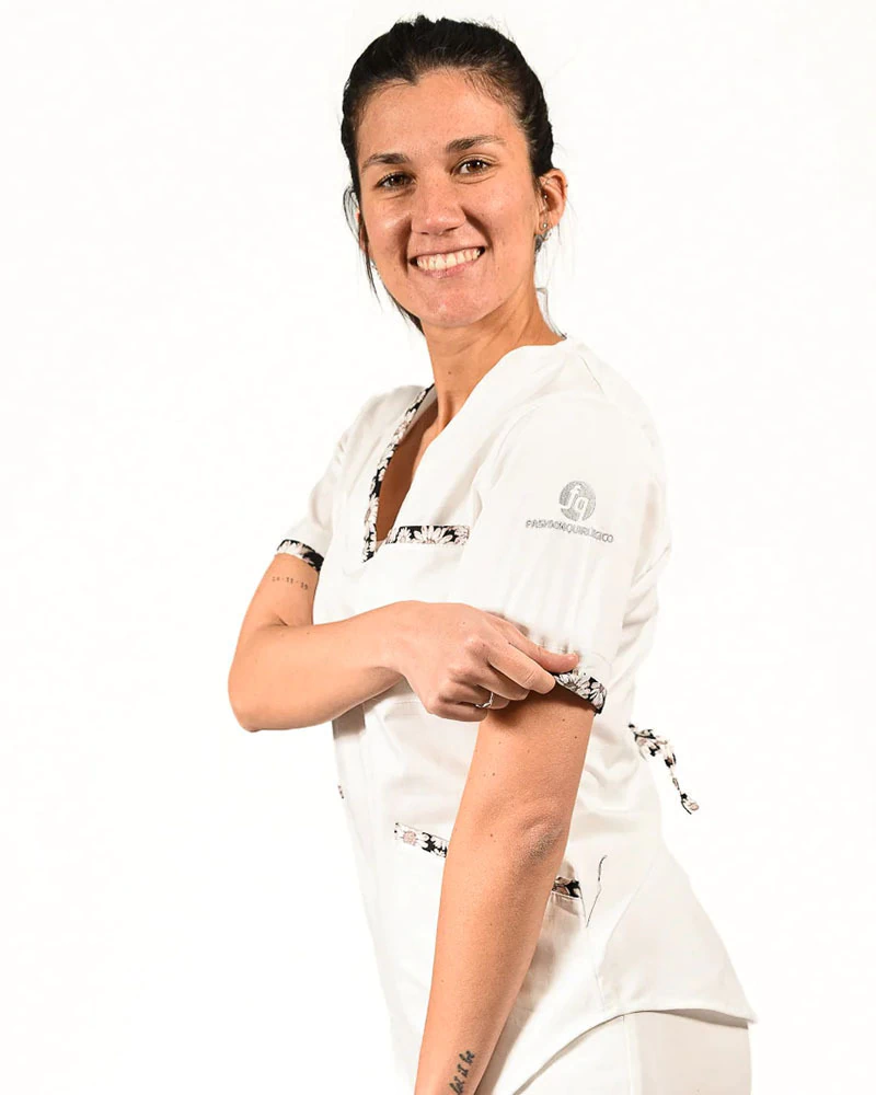Ambo confeccionado en tela spandex con pantalón de flores blancas, negras y grises exclsuiva de nuestra empresa , diseñado para brindarte comodidad, frescura y practicidad en cada jornada laboral.